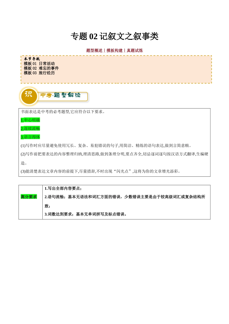 专题02记叙文之叙事类题型概述|模板构建|真题试炼书面表达是中考的必考题型,它应符合以下要求。1.中心明确2.连续流畅3.语言得体(1)写作时应尽量避免使用冗长、复杂、易犯错误的句子,用简洁、精练的语句表达,做...