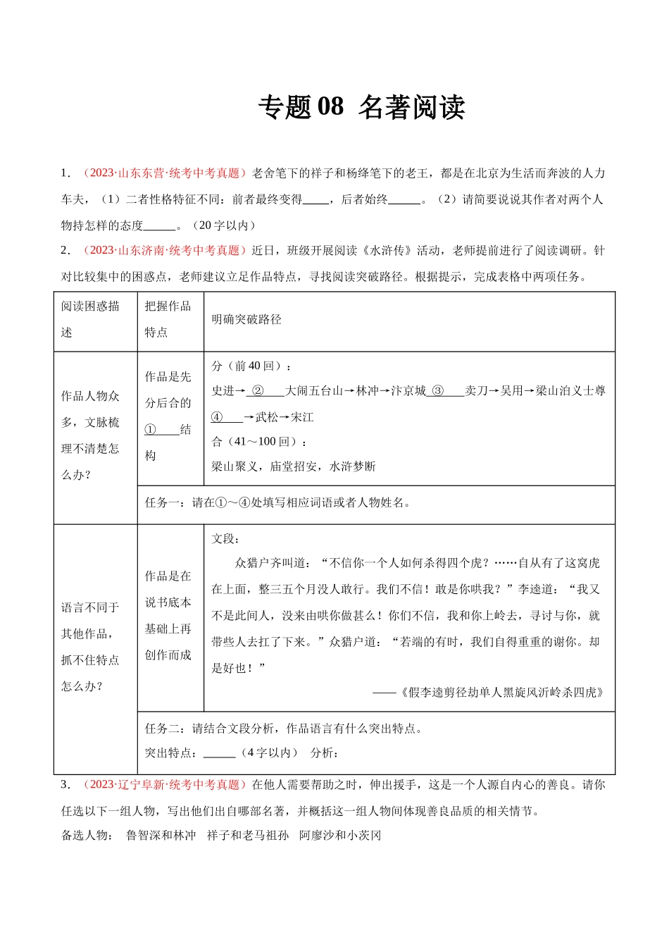 专题08名著阅读1.(2023·山东东营·统考中考真题)老舍笔下的祥子和杨绛笔下的老王,都是在北京为生活而奔波的人力车夫,(1)二者性格特征不同:前者最终变得,后者始终。(2)请简要说说其作者对两个人物持怎...