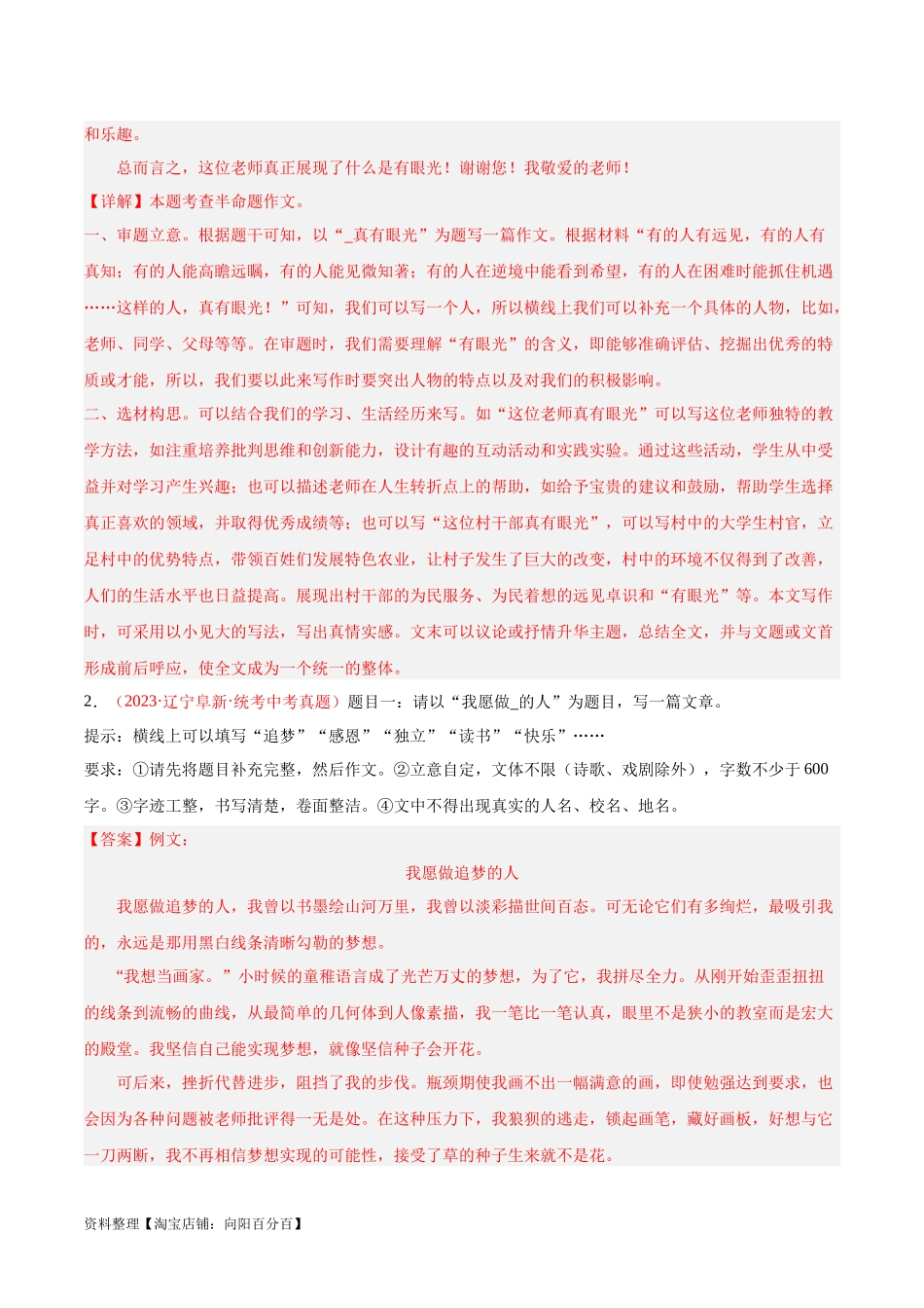 专题11作文1.(2023·山东东营·统考中考真题)阅读下面的材料,按要求作文。雾里花,云中月,生活中总有一些纷扰和莫测,需要我们有一双慧眼。有的人有远见,有的人有真知;有的人能高瞻远瞩,有的人能见微知著...