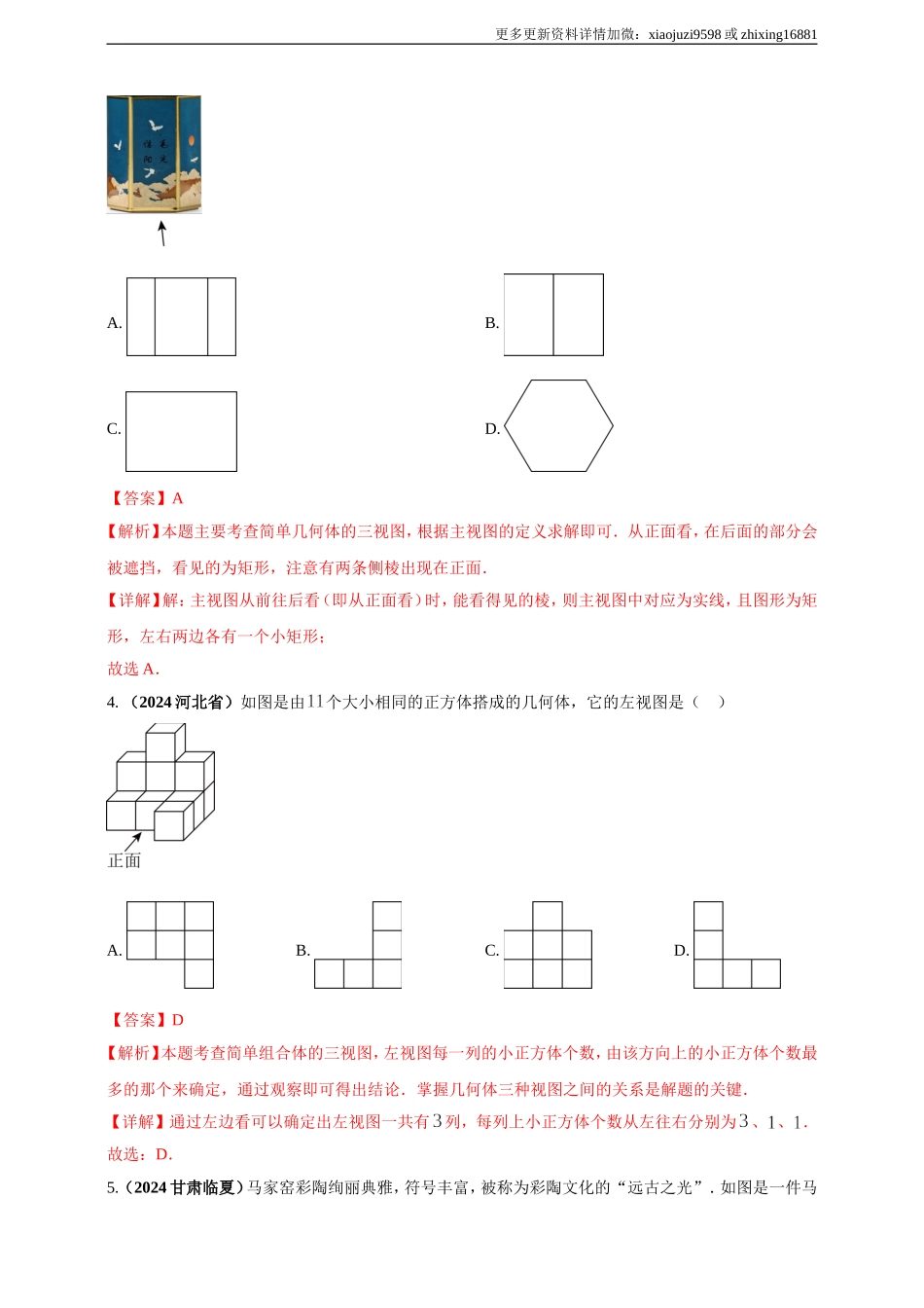 更多更新资料详情加微:xiaojuzi9598或zhixing168812024年中考数学真题专题分类精选汇编(2025年中考复习全国通用)专题26投影与视图一、选择题1.(2024甘肃威武)如图所示,该几何体的主视图是()A.B.C.D.【答...