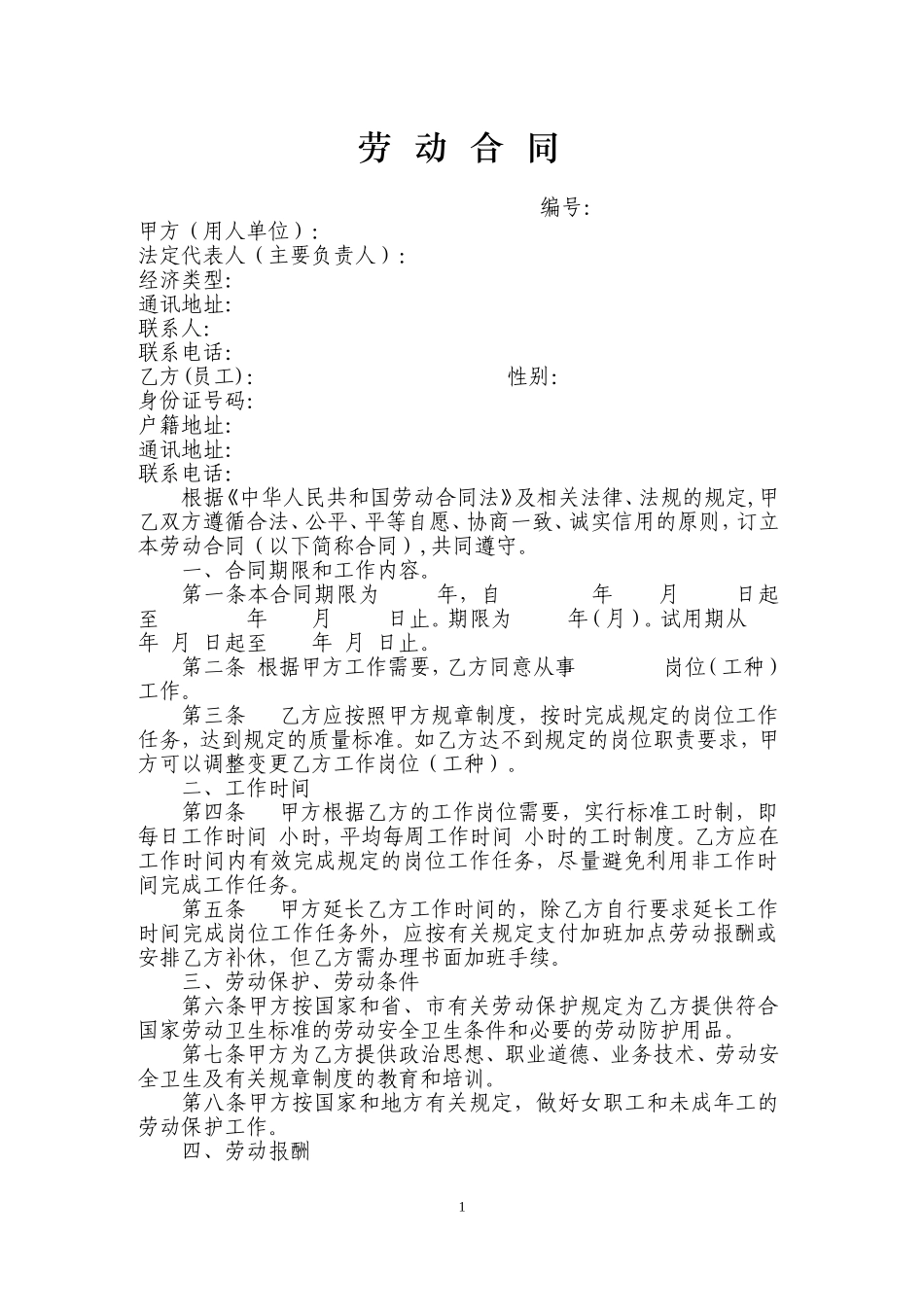 劳动合同编号:甲方(用人单位):法定代表人(主要负责人):经济类型:通讯地址:联系人:联系电话:乙方(员工):性别:身份证号码:户籍地址:通讯地址:联系电话:根据《中华人民共和国劳动合同法》及相关法...