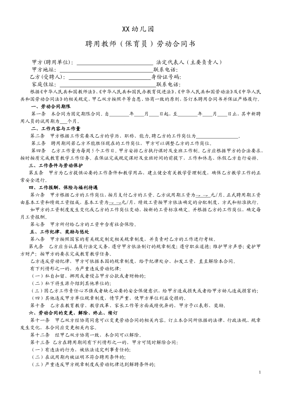 XX幼儿园聘用教师(保育员)劳动合同书甲方(聘用单位):法定代表人(主要负责人)甲方地址:联系电话:乙方(受聘人):身份证号码:家庭住址:联系电话:根据《中华人民共和国教师法》、《中华人民共和国民办教育...