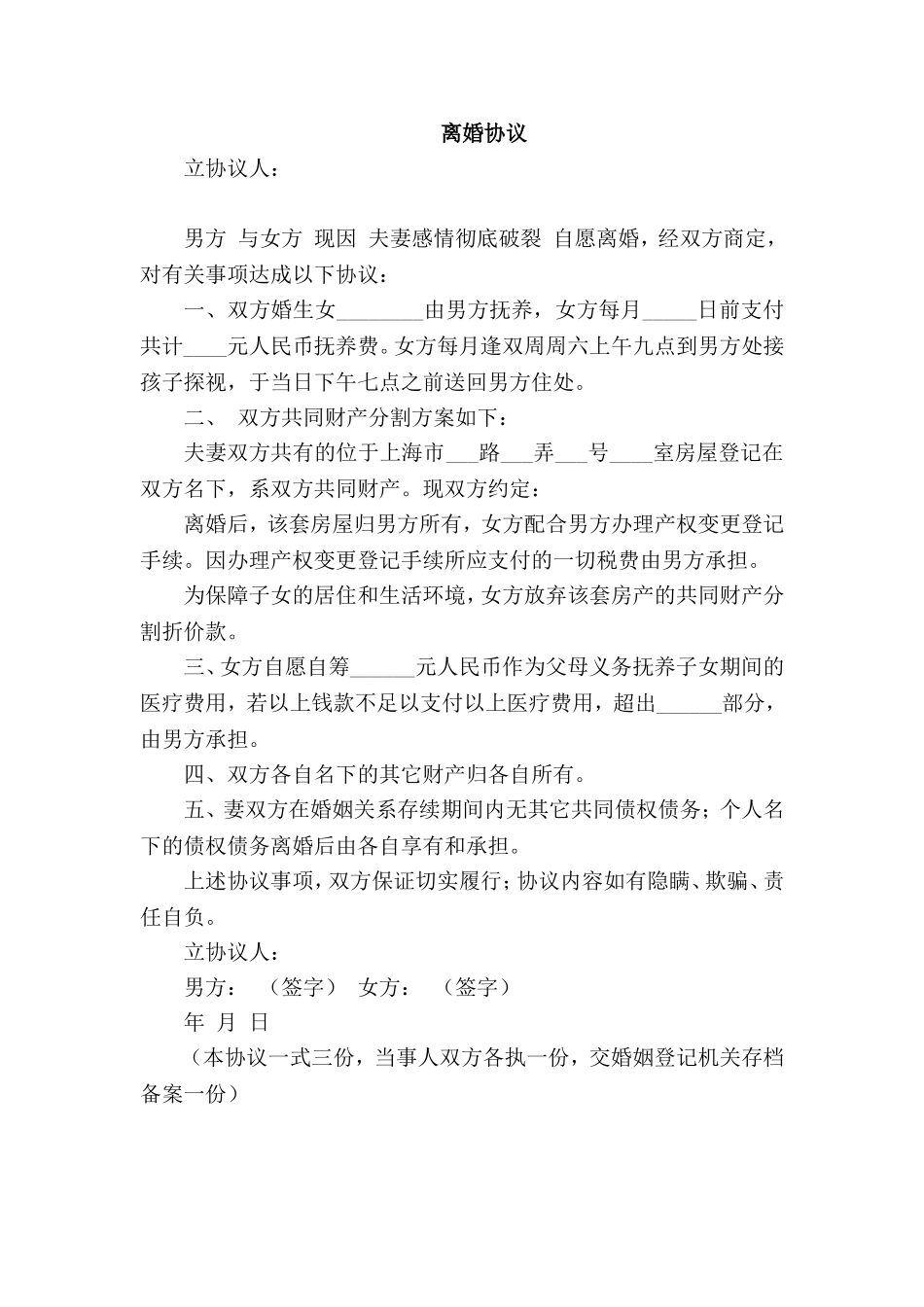 离婚协议立协议人:男方与女方现因夫妻感情彻底破裂自愿离婚,经双方商定,对有关事项达成以下协议:一、双方婚生女________由男方抚养,女方每月_____日前支付共计____元人民币抚养费。女方每月逢双周周六上午九...