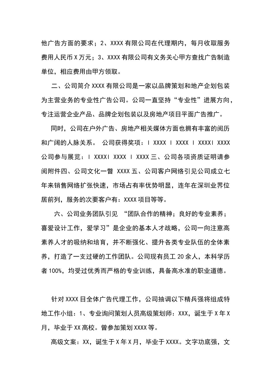 宣传片投标方案范本1.广告制造投标书范本一个简洁范本,供参考。投标项目:项目广告包装投标单位:有限公司负责人:联系电话:通讯地址:邮政编码:一、投标项目说明在XX市民的热切关注和期盼下,XXXX项目即将面...