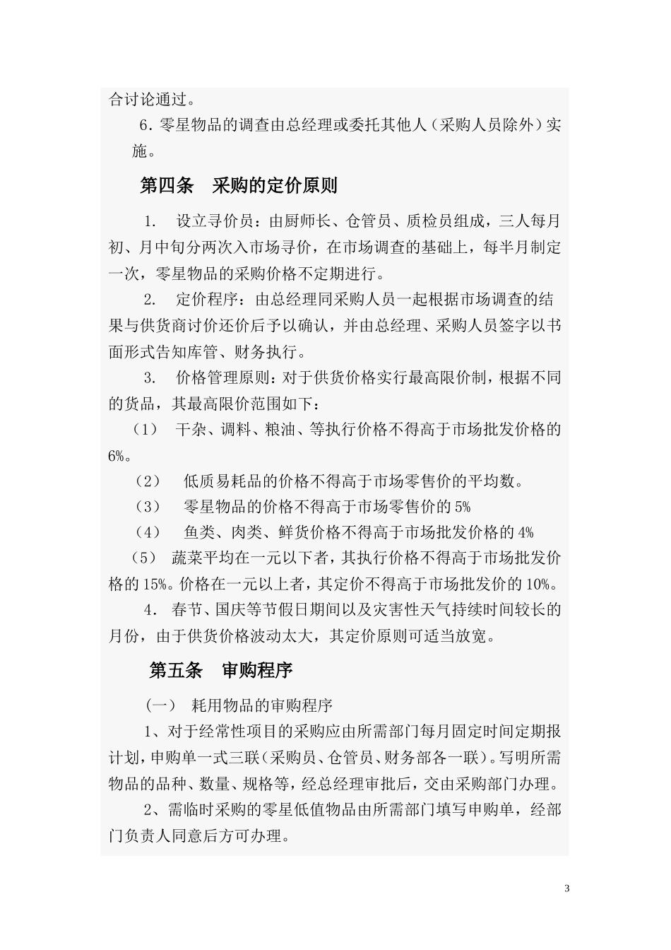 餐饮企业采购管理制度作者:出处:更新时间:2007年04月10日为规范原材料的采购程序、节约采购成本、满足经营的需求、提高经济效益、特制定本制度。采贮管理流程分采购、验收、仓管、发放四个环节,针对各餐饮企...