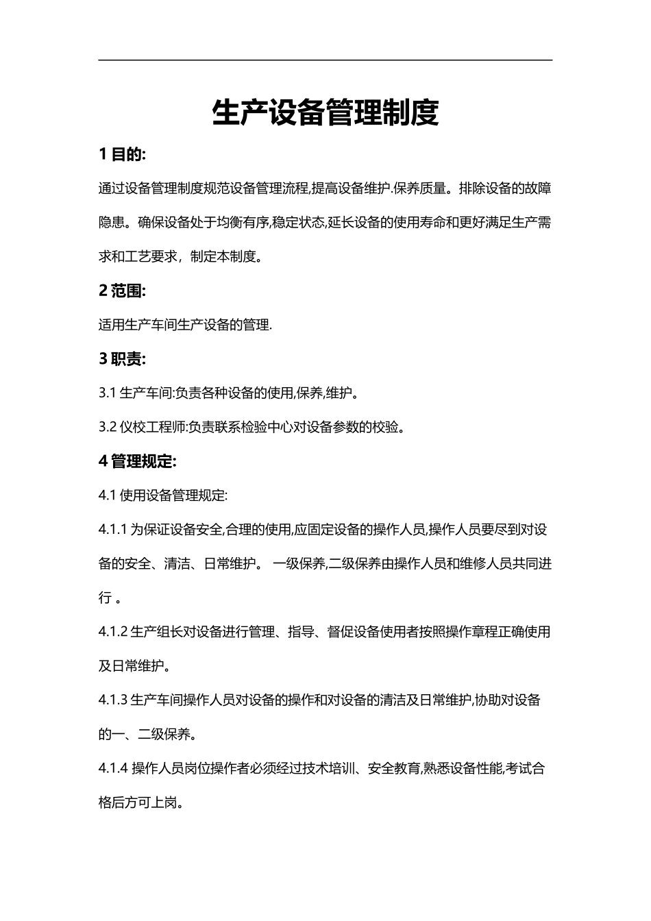 生产设备管理制度1目的:通过设备管理制度规范设备管理流程,提高设备维护.保养质量。排除设备的故障隐患。确保设备处于均衡有序,稳定状态,延长设备的使用寿命和更好满足生产需求和工艺要求,制定本制度。2范围:适...