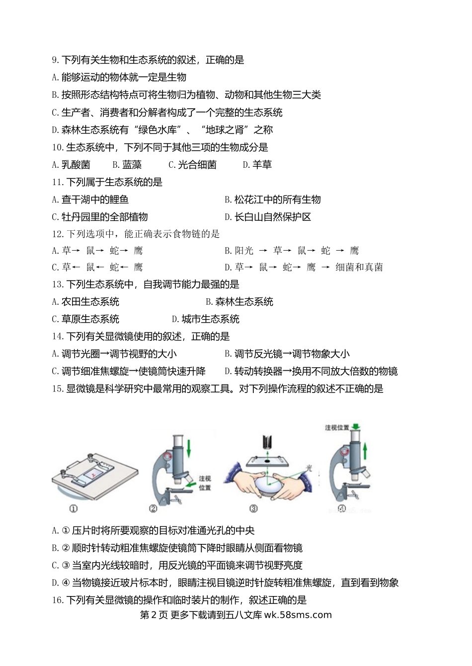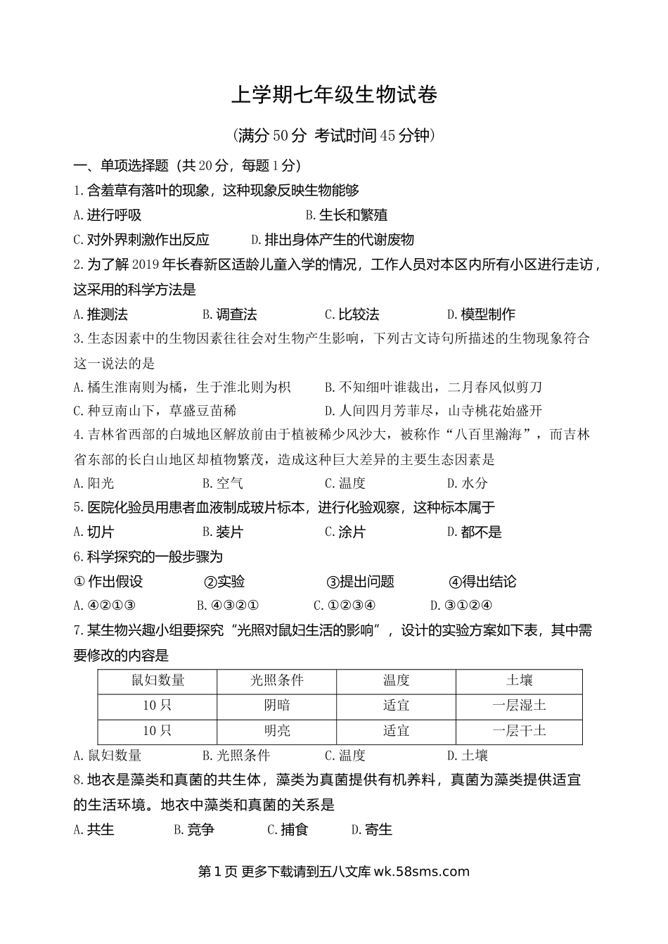 上学期七年级生物试卷(满分50分考试时间45分钟)一、单项选择题(共20分,每题1分)1.含羞草有落叶的现象,这种现象反映生物能够A.进行呼吸B.生长和繁殖C.对外界刺激作出反应D.排出身体产生的代谢废物2.为了解2019...