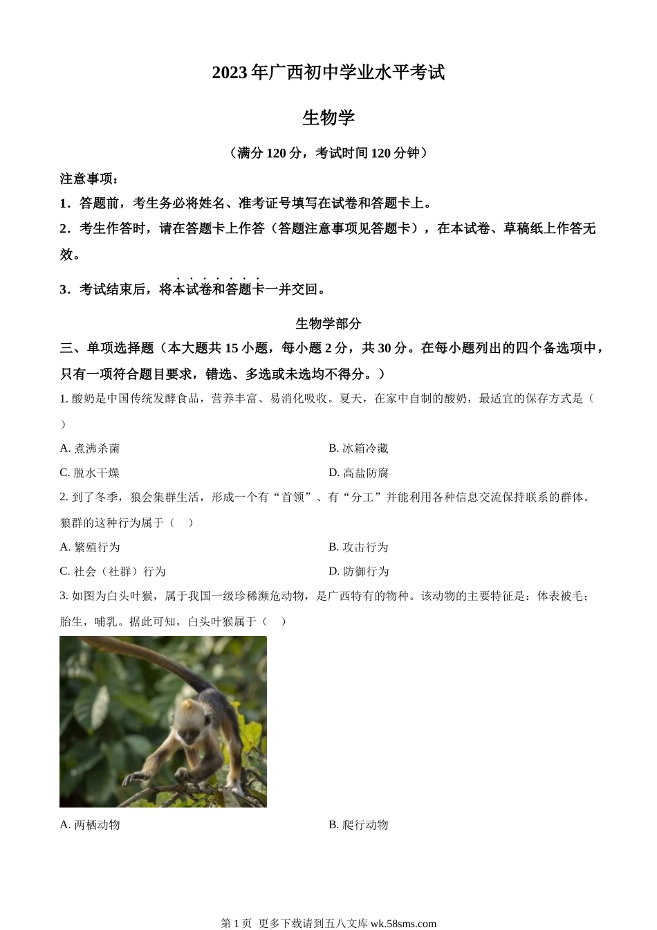 2023年广西初中学业水平考试生物学(满分120分,考试时间120分钟)注意事项:1.答题前,考生务必将姓名、准考证号填写在试卷和答题卡上。2.考生作答时,请在答题卡上作答(答题注意事项见答题卡),在本试卷、...
