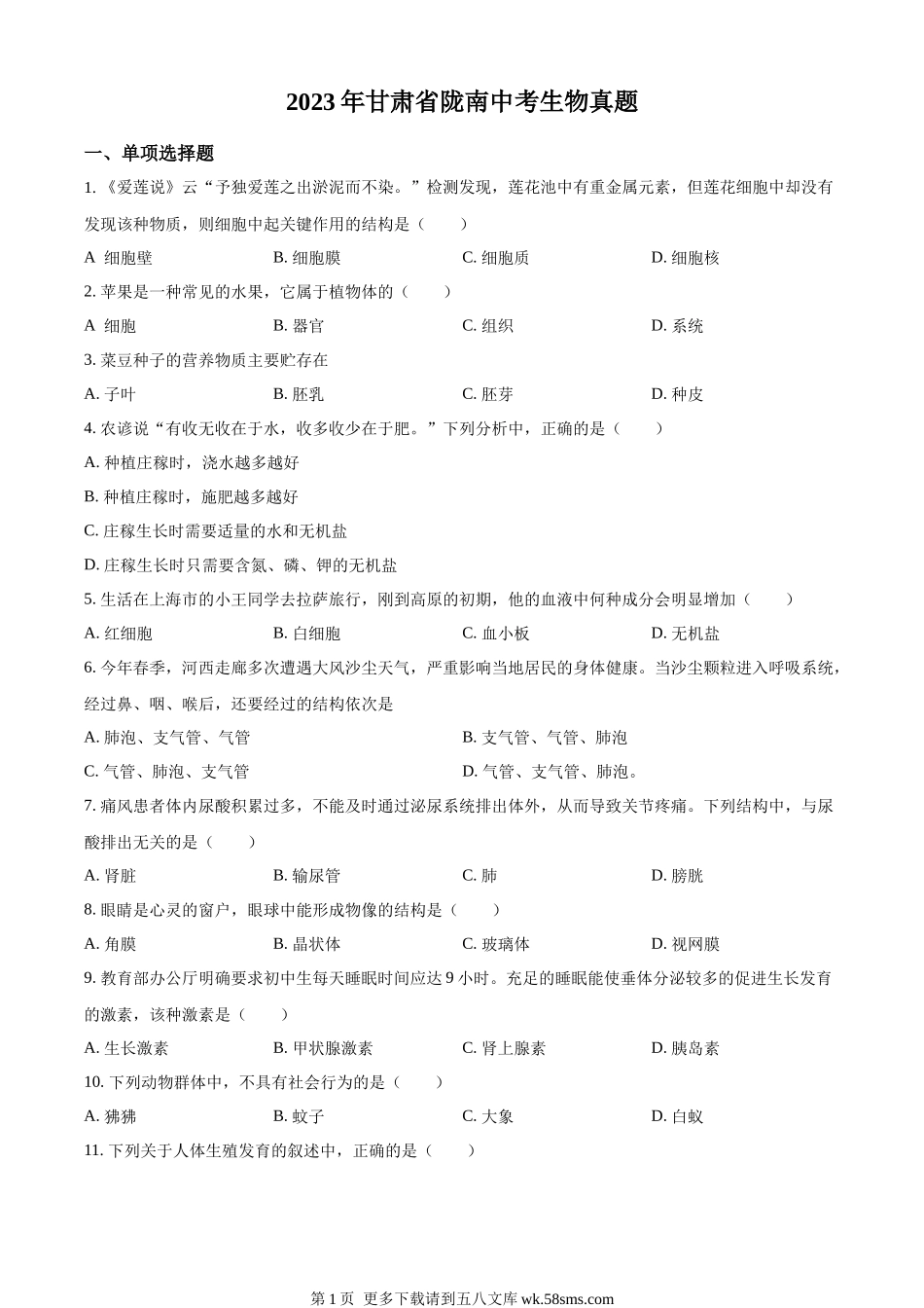 2023年甘肃省陇南中考生物真题一、单项选择题1.《爱莲说》云“予独爱莲之出淤泥而不染。”检测发现,莲花池中有重金属元素,但莲花细胞中却没有发现该种物质,则细胞中起关键作用的结构是()A.细胞壁B.细胞膜C....