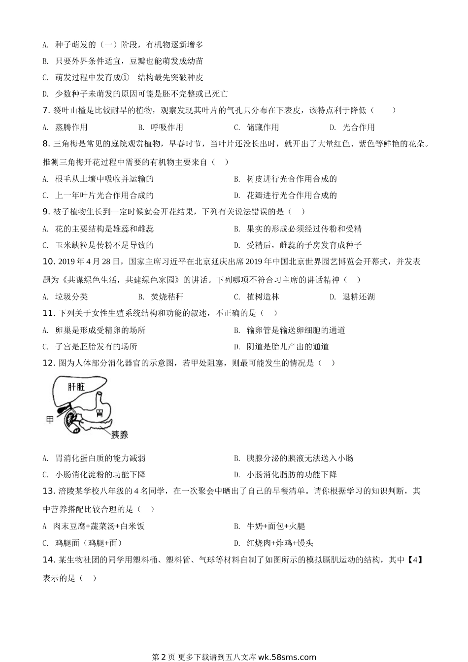 重庆市涪陵区2020年初中结业考试生物试题(原卷版).doc_第2页