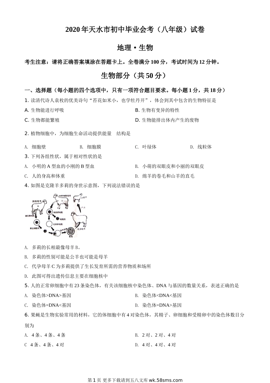 2020年天水市初中毕业会考(八年级)试卷地理·生物考生注意:请将正确答案填涂在答题卡上。全卷满分100分,考试时间为12分钟。生物部分(共50分)一、选择题(每小题的四个选项中,只有一项符合题目要求。每小题...