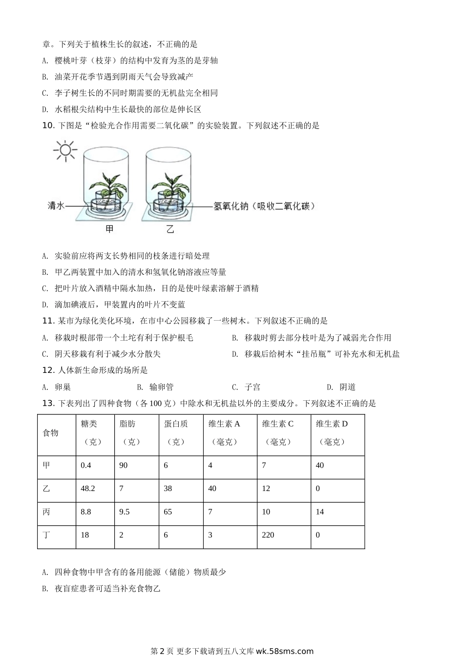 云南省2021年中考生物试题(原卷版).doc_第2页
