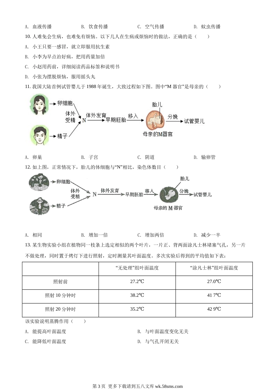 2022年山西省阳泉市、长治市中生物真题题(原卷版).docx_第3页