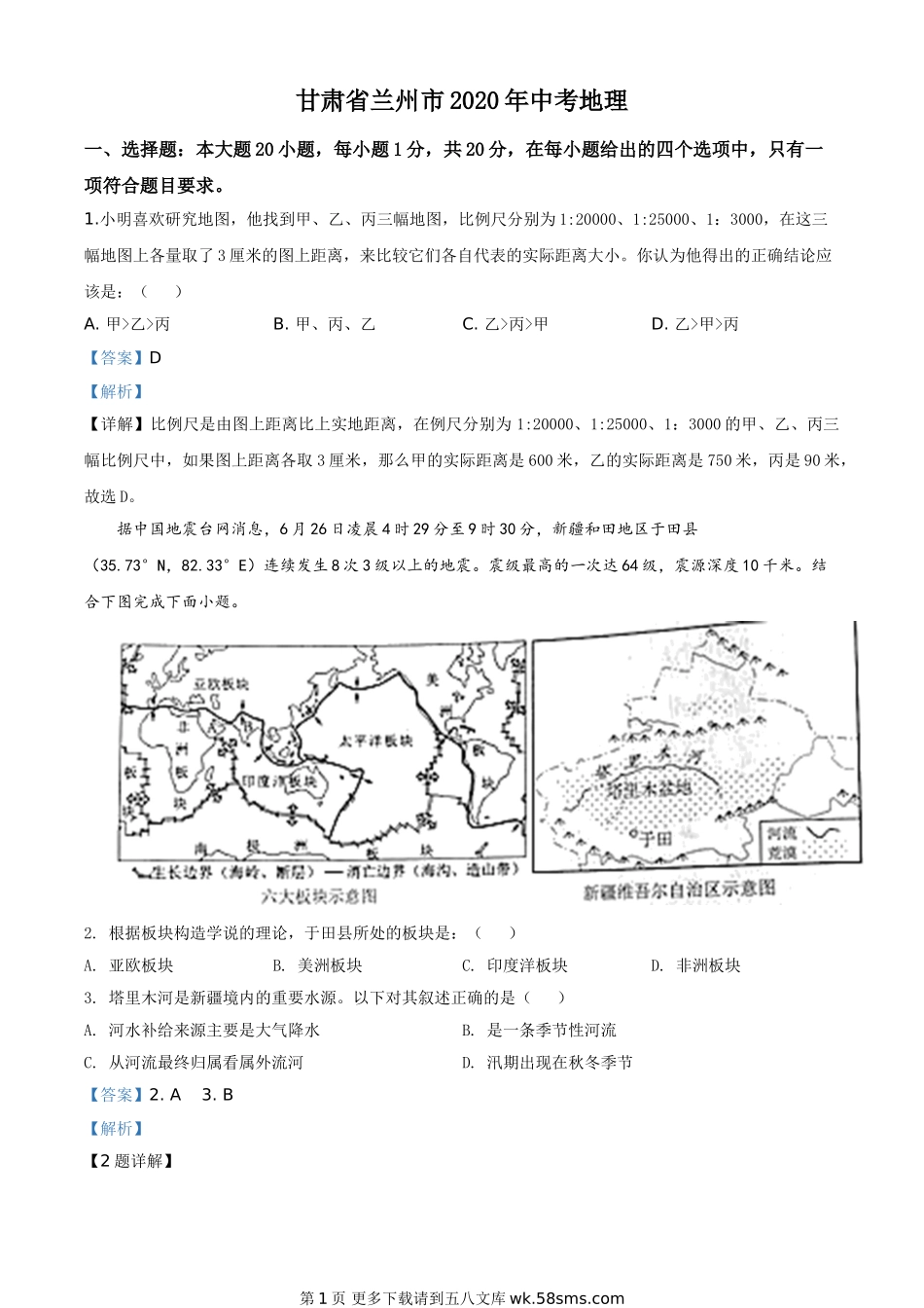 甘肃省兰州市2020年中考地理一、选择题:本大题20小题,每小题1分,共20分,在每小题给出的四个选项中,只有一项符合题目要求。1.小明喜欢研究地图,他找到甲、乙、丙三幅地图,比例尺分别为1:20000、1:25000、1...