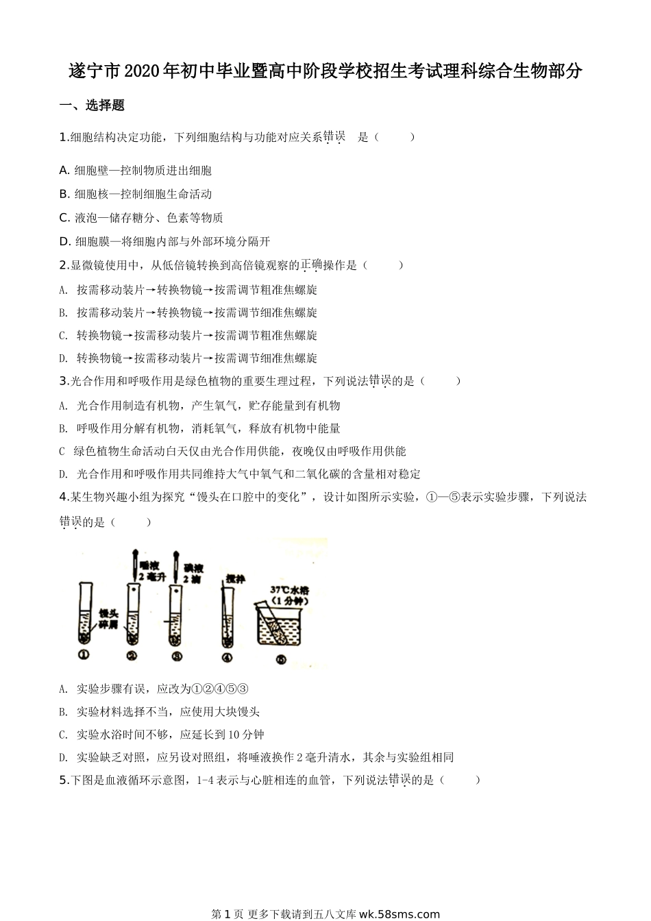 遂宁市2020年初中毕业暨高中阶段学校招生考试理科综合生物部分一、选择题1.细胞结构决定功能,下列细胞结构与功能对应关系错误的是()A.细胞壁—控制物质进出细胞B.细胞核—控制细胞生命活动C.液泡—储存糖分、...