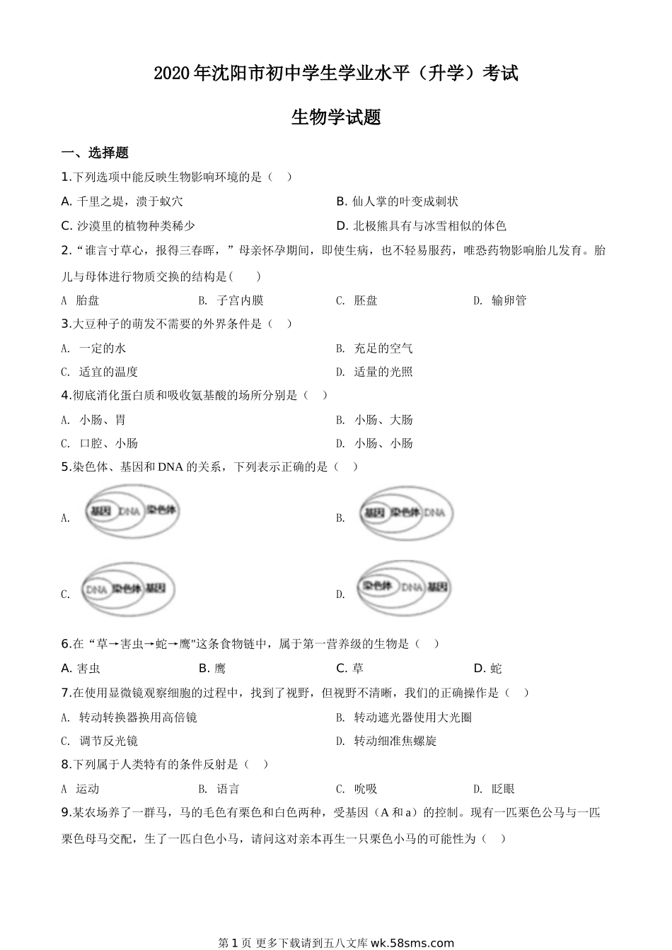 2020年沈阳市初中学生学业水平(升学)考试生物学试题一、选择题1.下列选项中能反映生物影响环境的是()A.千里之堤,溃于蚁穴B.仙人掌的叶变成刺状C.沙漠里的植物种类稀少D.北极熊具有与冰雪相似的体色2.“谁言...