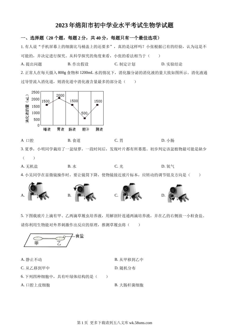 2023年绵阳市初中学业水平考试生物学试题一、选择题(20个题,每题2分,共40分,每题只有一个最佳选项)1.有人说“手机屏幕上的细菌比马桶盖上的还要多”,真的是这样吗?小张根据已有的经验,认为这是不可能的,...