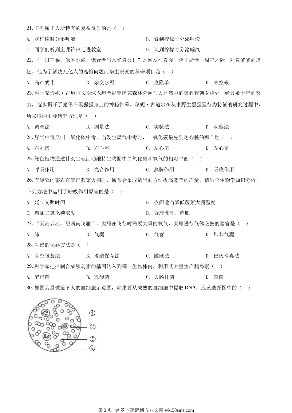 2022年黑龙江省龙东地区中考生物真题(原卷版).docx_第3页