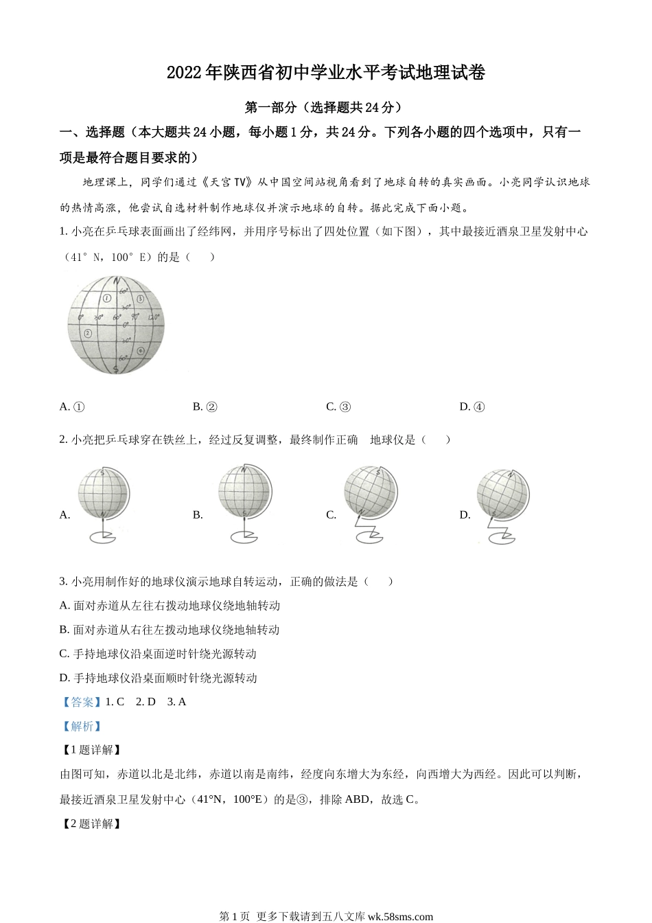 2022年陕西省初中学业水平考试地理试卷第一部分(选择题共24分)一、选择题(本大题共24小题,每小题1分,共24分。下列各小题的四个选项中,只有一项是最符合题目要求的)地理课上,同学们通过《天宫TV》从中国空...