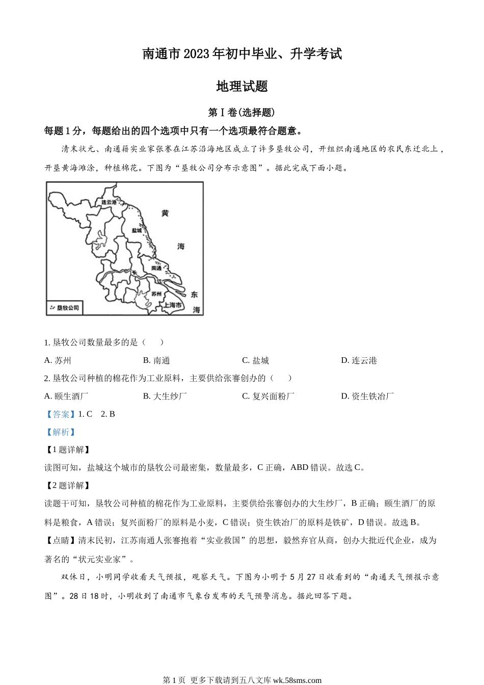 南通市2023年初中毕业、升学考试地理试题第Ⅰ卷(选择题)每题1分,每题给出的四个选项中只有一个选项最符合题意。清末状元、南通籍实业家张謇在江苏沿海地区成立了许多垦牧公司,开组织南通地区的农民东迁北上,开...