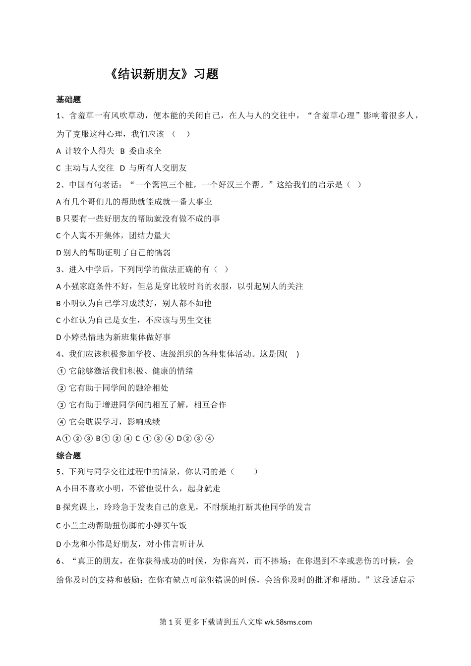 《结识新朋友》习题基础题1、含羞草一有风吹草动,便本能的关闭自己,在人与人的交往中,“含羞草心理”影响着很多人,为了克服这种心理,我们应该()A计较个人得失B委曲求全C主动与人交往D与所有人交朋友2、中...