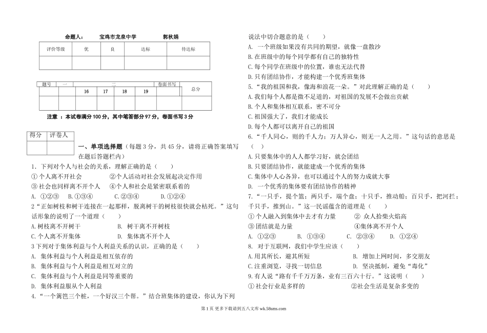 命题人:宝鸡市龙泉中学郭秋娟注意:本试卷满分100分,其中笔答部分97分,卷面书写3分一、单项选择题(每题3分,共45分,请将正确答案填写在题后答题栏内)1.下列对个人与社会的关系,理解正确的是()①个人离...