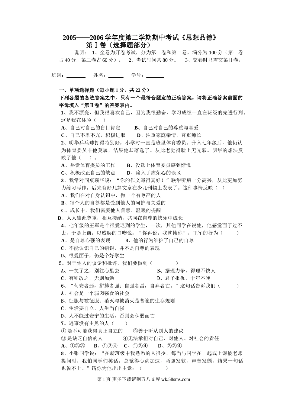 2005——2006学年度第二学期期中考试《思想品德》第Ⅰ卷(选择题部分)说明:1、全卷为开卷考试,分为第一卷和第二卷,满分为100分(第一卷占40分,第二卷占60分)。2、考试时间共80分。3、交卷时只需交第Ⅱ卷。...