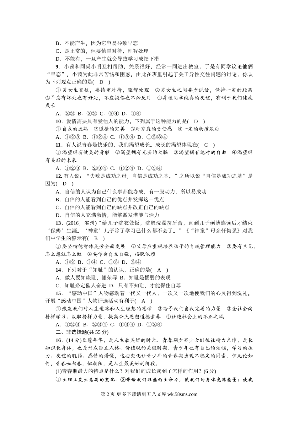 七年级道德与法治下册第一单元 青春时光单元综合测试题及答案.doc_第2页