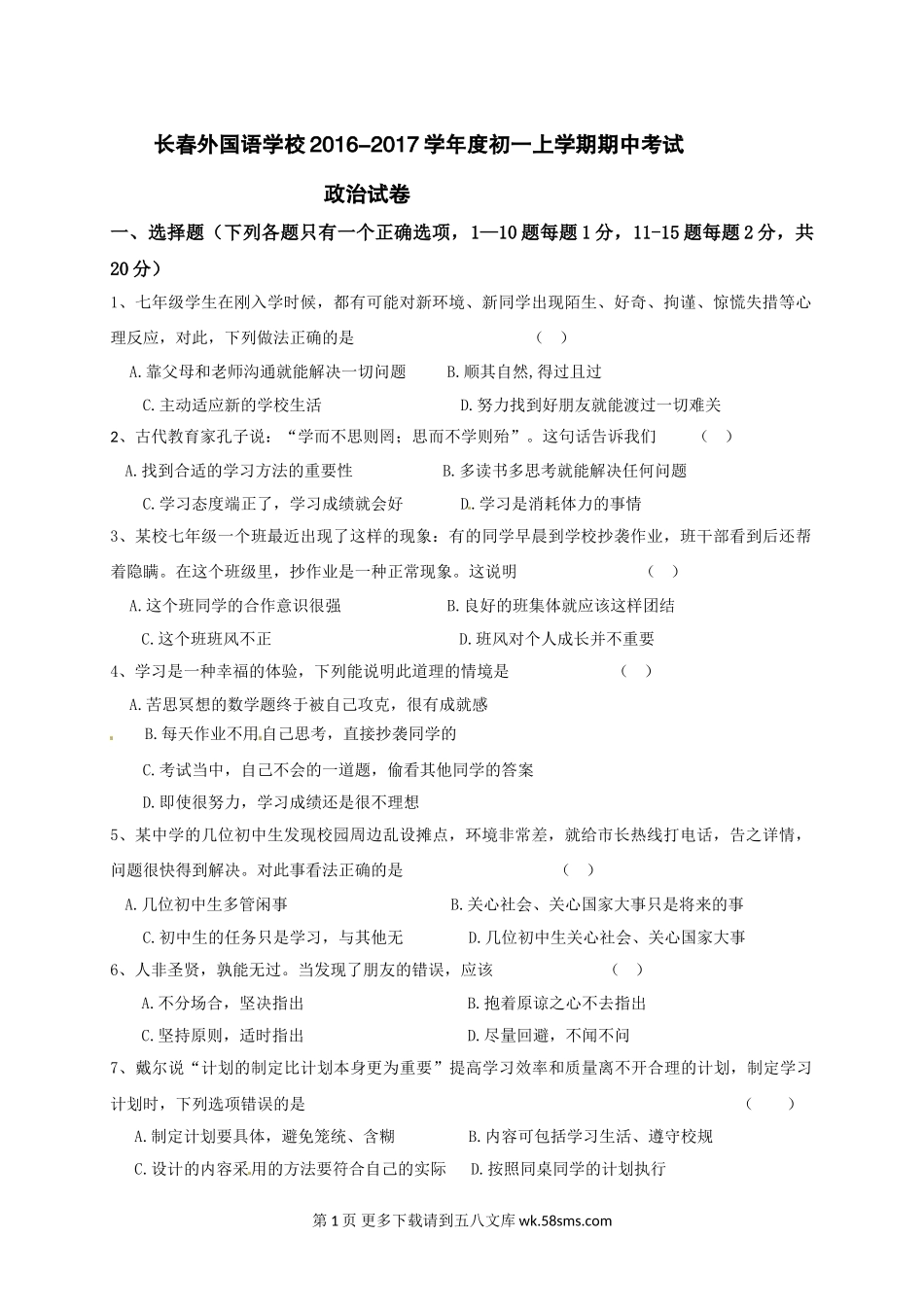 长春外国语学校2016-2017学年度初一上学期期中考试政治试卷一、选择题(下列各题只有一个正确选项,1—10题每题1分,11-15题每题2分,共20分)1、七年级学生在刚入学时候,都有可能对新环境、新同学出现陌生、好...