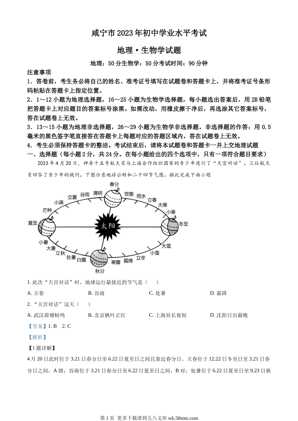 咸宁市2023年初中学业水平考试地理·生物学试题地理:50分生物学:50分考试时间:90分钟注意事项1.答卷前,考生务必将自己的姓名、准考证号填写在试题卷和答题卡上,并将准考证号条形码粘贴在答题卡上指定位置。...