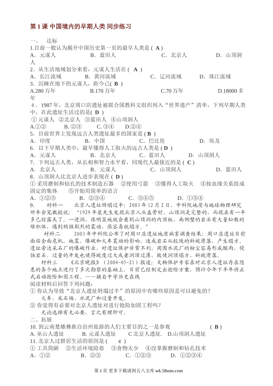 第1课中国境内的早期人类同步练习一、达标1.目前一般认为揭开中国历史第一页的最早人类是(A)A.元谋人B.蓝田人C.北京人D.山顶洞人2.从生活地域划分来看,元谋人生活在(A)A.长江流域B.黄河流域C.辽河流域D...