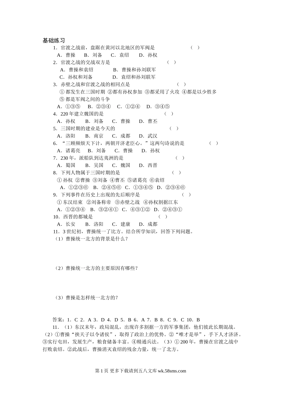 基础练习1.官渡之战前,盘踞在黄河以北地区的军阀是()A.曹操B.刘备C.袁绍D.孙权2.官渡之战的交战双方是()A.曹操和袁绍B.曹操和孙刘联军C.孙权和刘备D.袁绍和孙刘联军3.赤壁之战和官渡之战的相同点...