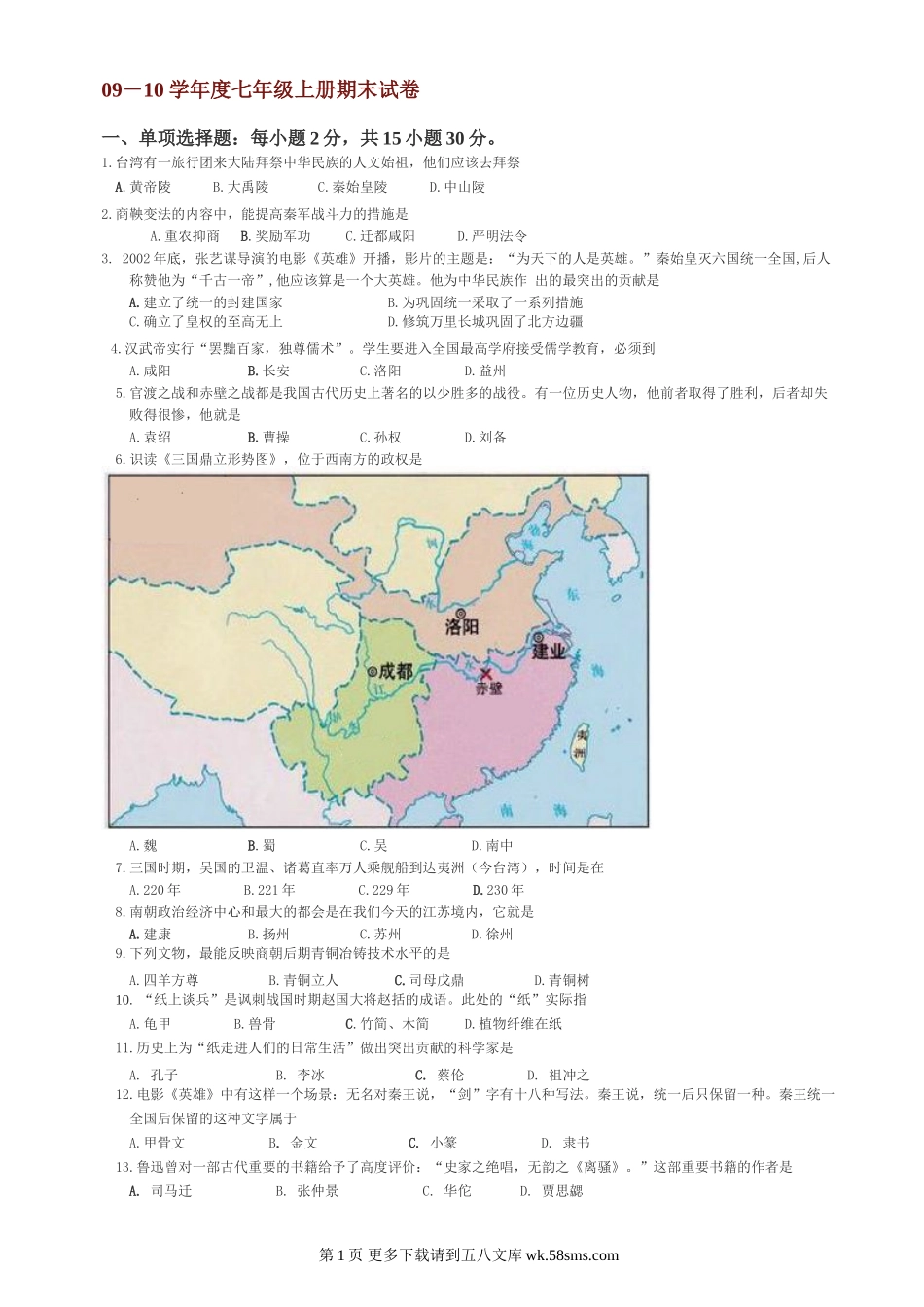 09-10学年度七年级上册期末试卷一、单项选择题:每小题2分,共15小题30分。1.台湾有一旅行团来大陆拜祭中华民族的人文始祖,他们应该去拜祭A.黄帝陵B.大禹陵C.秦始皇陵D.中山陵2.商鞅变法的内容中,能提高秦军战...