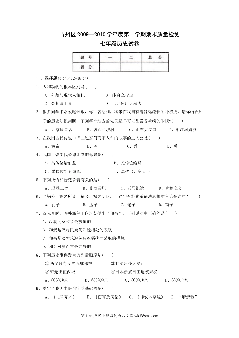 吉州区2009—2010学年度第一学期期末质量检测七年级历史试卷一、选择题(4分×12=48分)1、人和动物的根本区别是()A、外貌与现代人相似B、能直立行走C、会制造工具D、已经使用天然火2、很多同学平常爱吃米饭,你可...