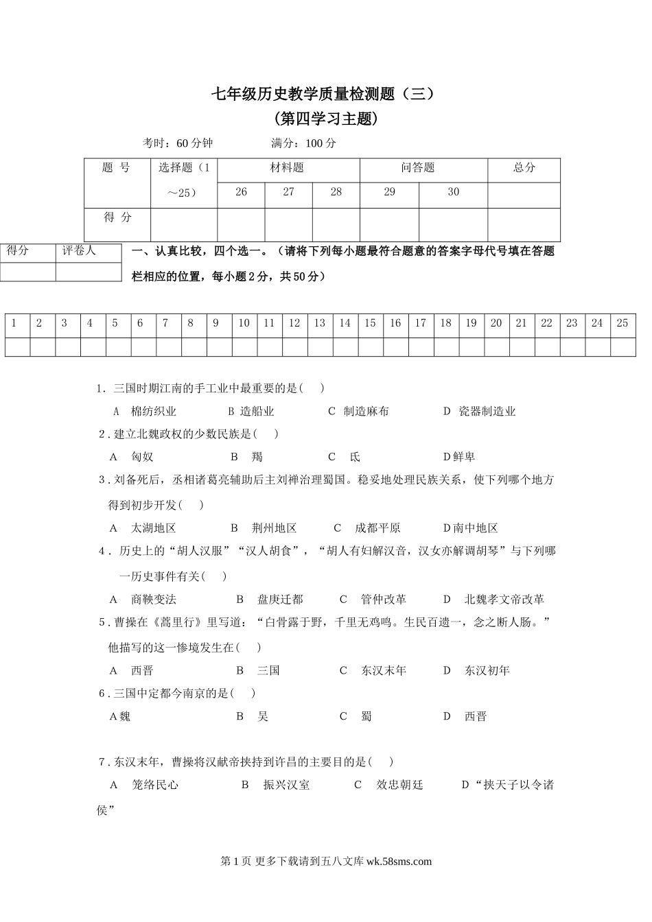 七年级历史教学质量检测题(三)(第四学习主题)考时:60分钟满分:100分题号选择题(1~25)材料题问答题总分2627282930得分一、认真比较,四个选一。(请将下列每小题最符合题意的答案字母代号填在答题栏相应的...