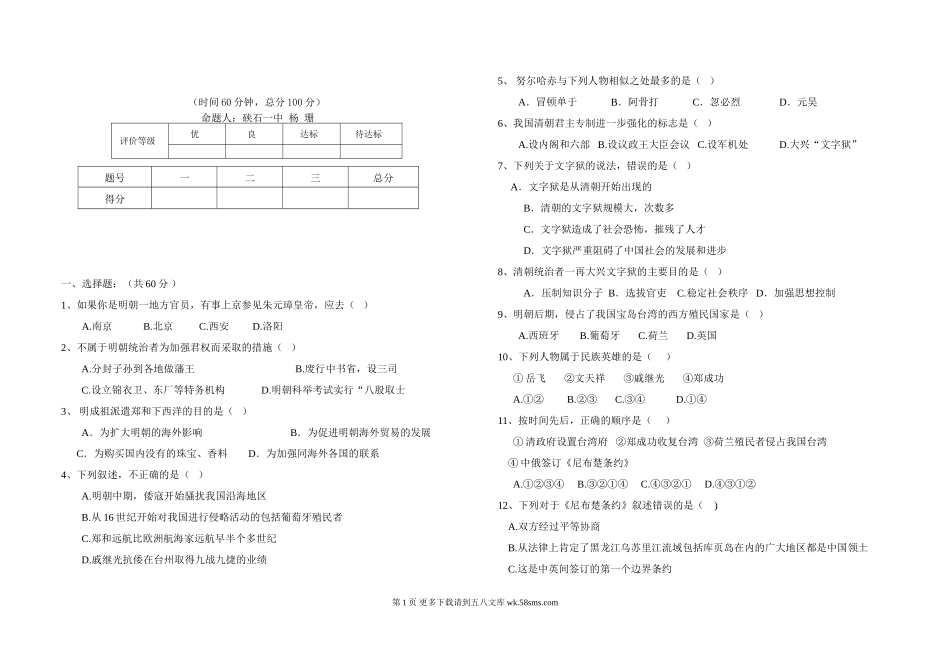 (时间60分钟,总分100分)命题人:硖石一中杨珊评价等级优良达标待达标一、选择题:(共60分)1、如果你是明朝一地方官员,有事上京参见朱元璋皇帝,应去()A.南京B.北京C.西安D.洛阳2、不属于明朝统治者为加强...