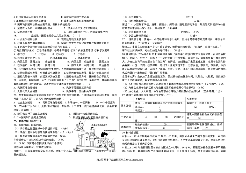 长泰一中、华安一中第二学期九年级月考思品测试卷时间:90分钟考试形式:闭卷分数:100分一、选择题(下列各题的四个选项中只有一项最符合题意,每小题2分,共48分)。1.有人说,责任是一种生命与生命传承的情感;...
