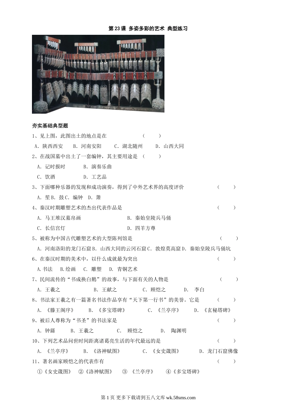 第23课多姿多彩的艺术典型练习夯实基础典型题1、见上图,此图出土的地点是在()A.陕西西安B.河南安阳C.湖北随州D.山西大同2、在战国墓中出土了一套编钟,其主要用途是()A.记时报时B.演奏乐曲C.饮酒D....