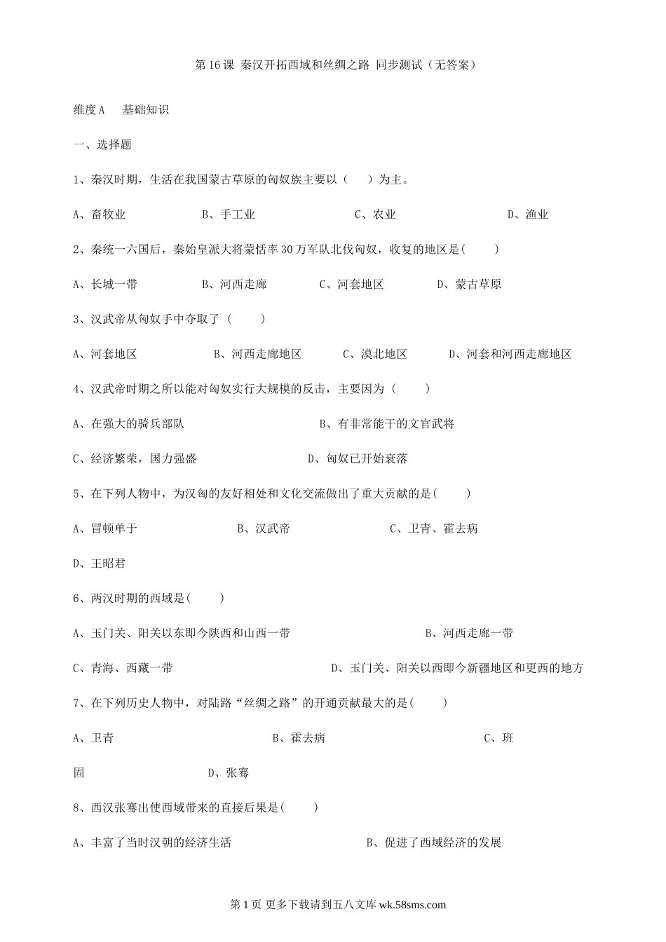 第16课秦汉开拓西域和丝绸之路同步测试(无答案)维度A基础知识一、选择题1、秦汉时期,生活在我国蒙古草原的匈奴族主要以()为主。A、畜牧业B、手工业C、农业D、渔业2、秦统一六国后,秦始皇派大将蒙恬率30万军...