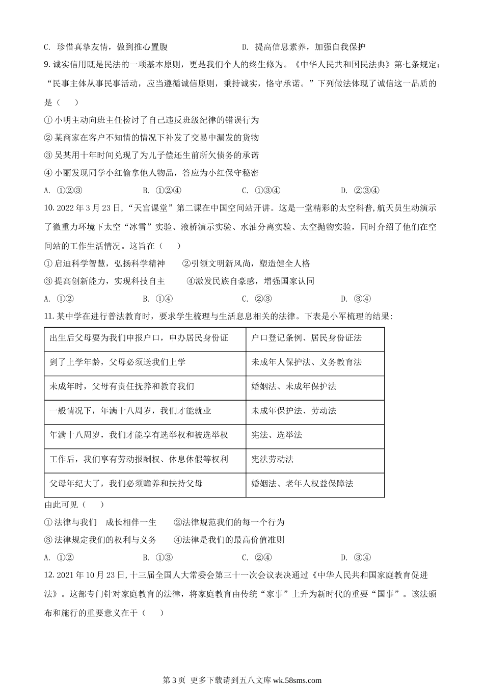 2022年四川省成都市毕业会考道德与法治试题(原卷版).docx_第3页