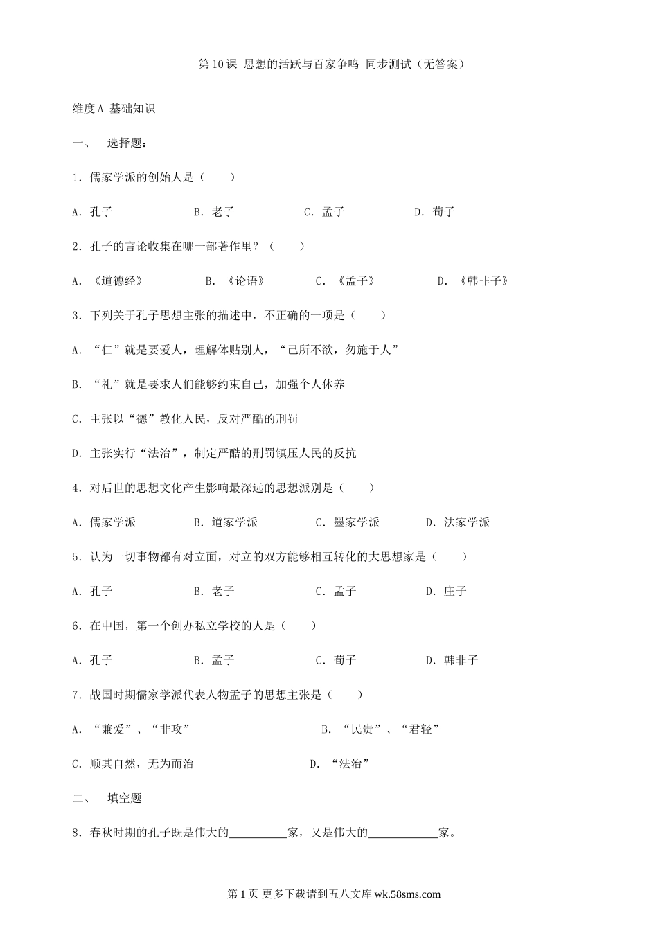 第10课思想的活跃与百家争鸣同步测试(无答案)维度A基础知识一、选择题:1.儒家学派的创始人是()A.孔子B.老子C.孟子D.荀子2.孔子的言论收集在哪一部著作里?()A.《道德经》B.《论语》C.《孟子》D....