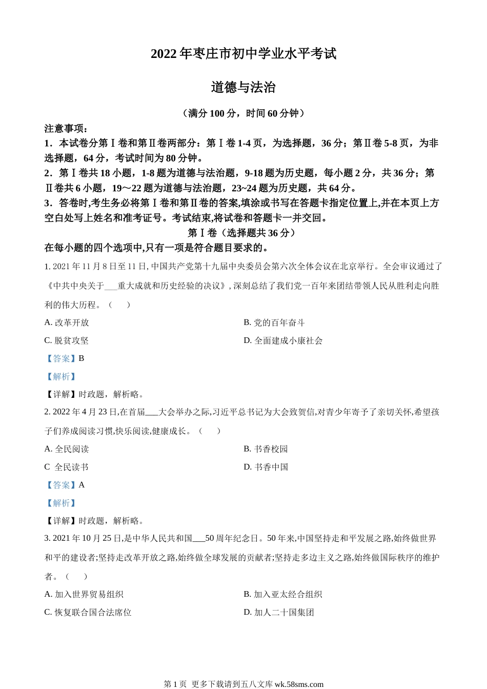 2022年枣庄市初中学业水平考试道德与法治(满分100分,时间60分钟)注意事项:1.本试卷分第Ⅰ卷和第Ⅱ卷两部分:第Ⅰ卷1-4页,为选择题,36分;第Ⅱ卷5-8页,为非选择题,64分,考试时间为80分钟。2.第Ⅰ卷共18...