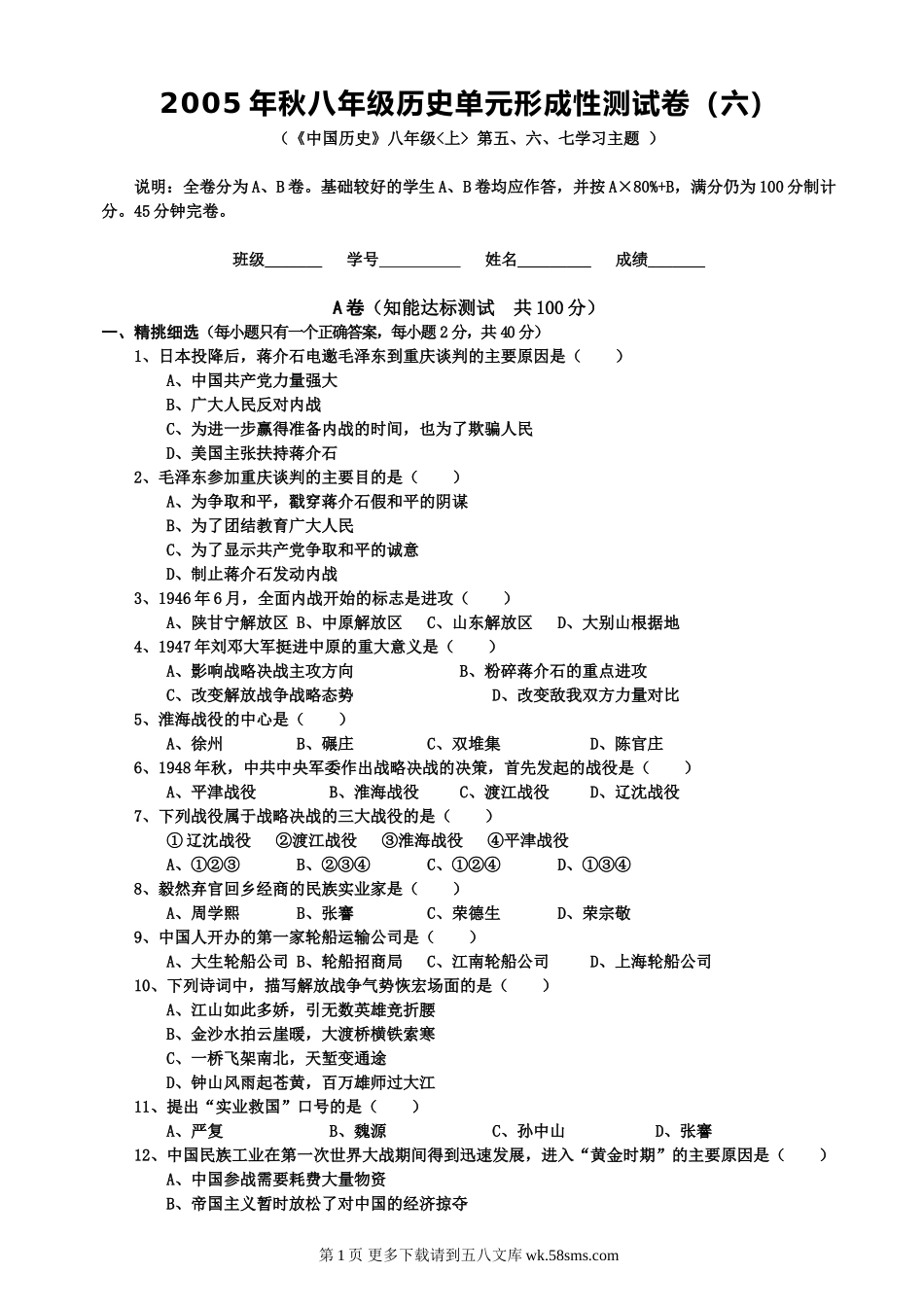 2005年秋八年级历史单元形成性测试卷(六)(《中国历史》八年级<上>第五、六、七学习主题)说明:全卷分为A、B卷。基础较好的学生A、B卷均应作答,并按A×80%+B,满分仍为100分制计分。45分钟完卷。班级_______...