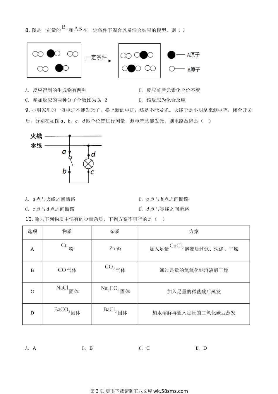 浙江省湖州市2020年中考科学试题(原卷版).doc_第3页