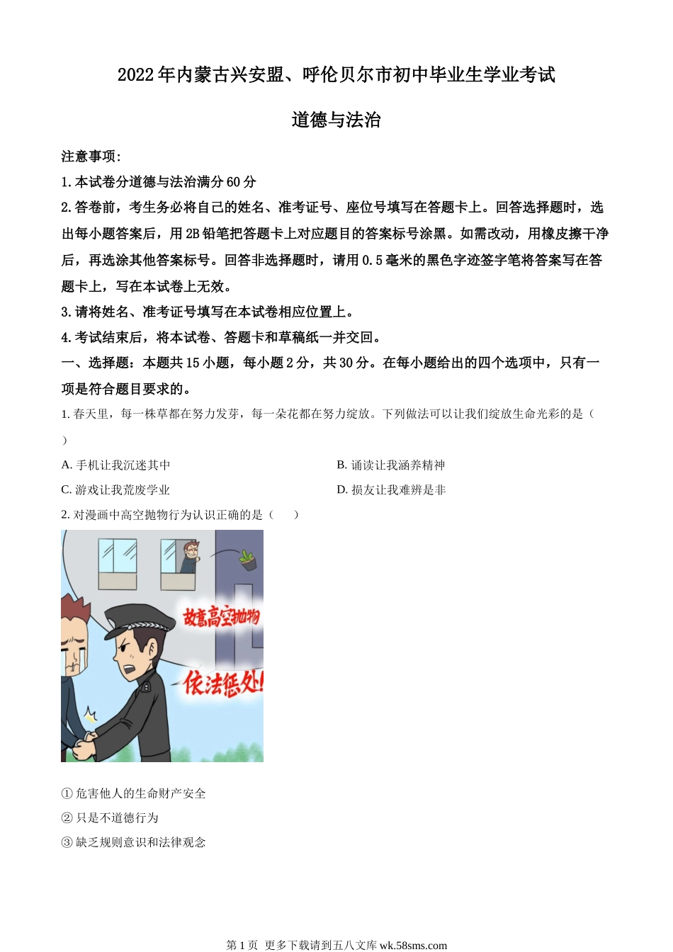 2022年内蒙古兴安盟、呼伦贝尔市初中毕业生学业考试道德与法治注意事项:1.本试卷分道德与法治满分60分2.答卷前,考生务必将自己的姓名、准考证号、座位号填写在答题卡上。回答选择题时,选出每小题答案后,用2B铅...