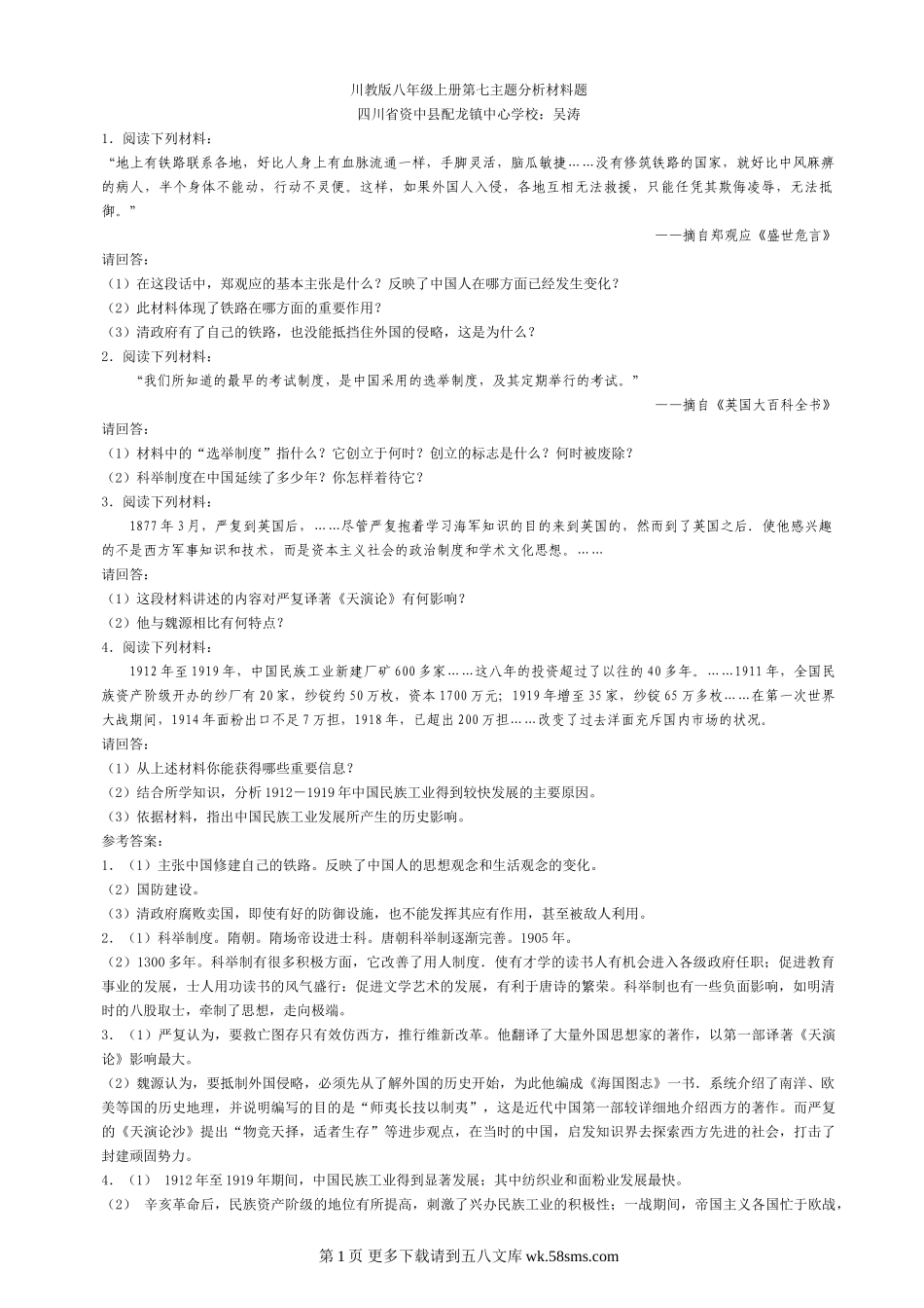 川教版八年级上册第七主题分析材料题四川省资中县配龙镇中心学校:吴涛1.阅读下列材料:“地上有铁路联系各地,好比人身上有血脉流通一样,手脚灵活,脑瓜敏捷……没有修筑铁路的国家,就好比中风麻痹的病人,半...