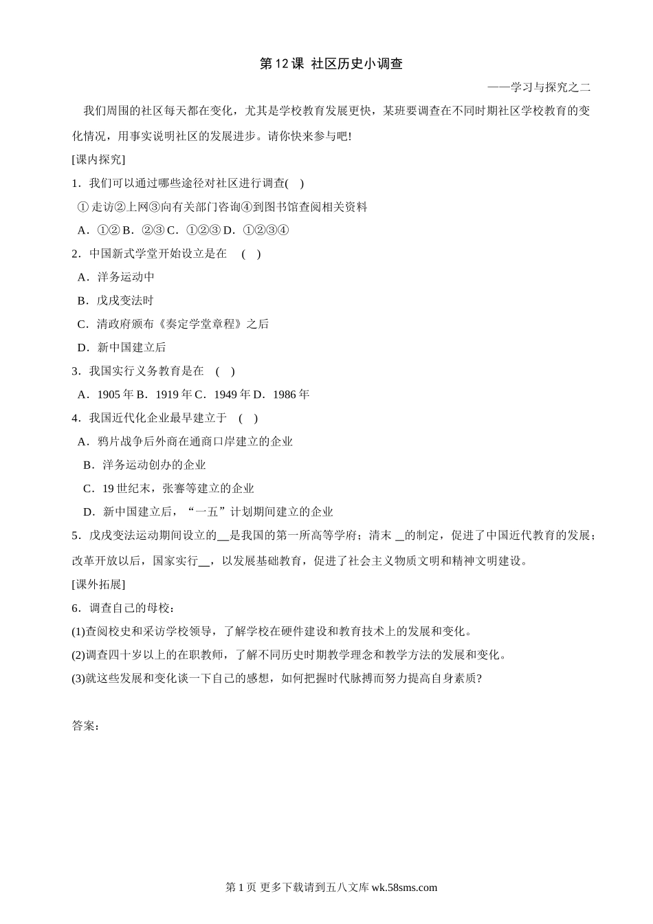 第12课社区历史小调查同步练习1(北师大版八上).doc_第1页