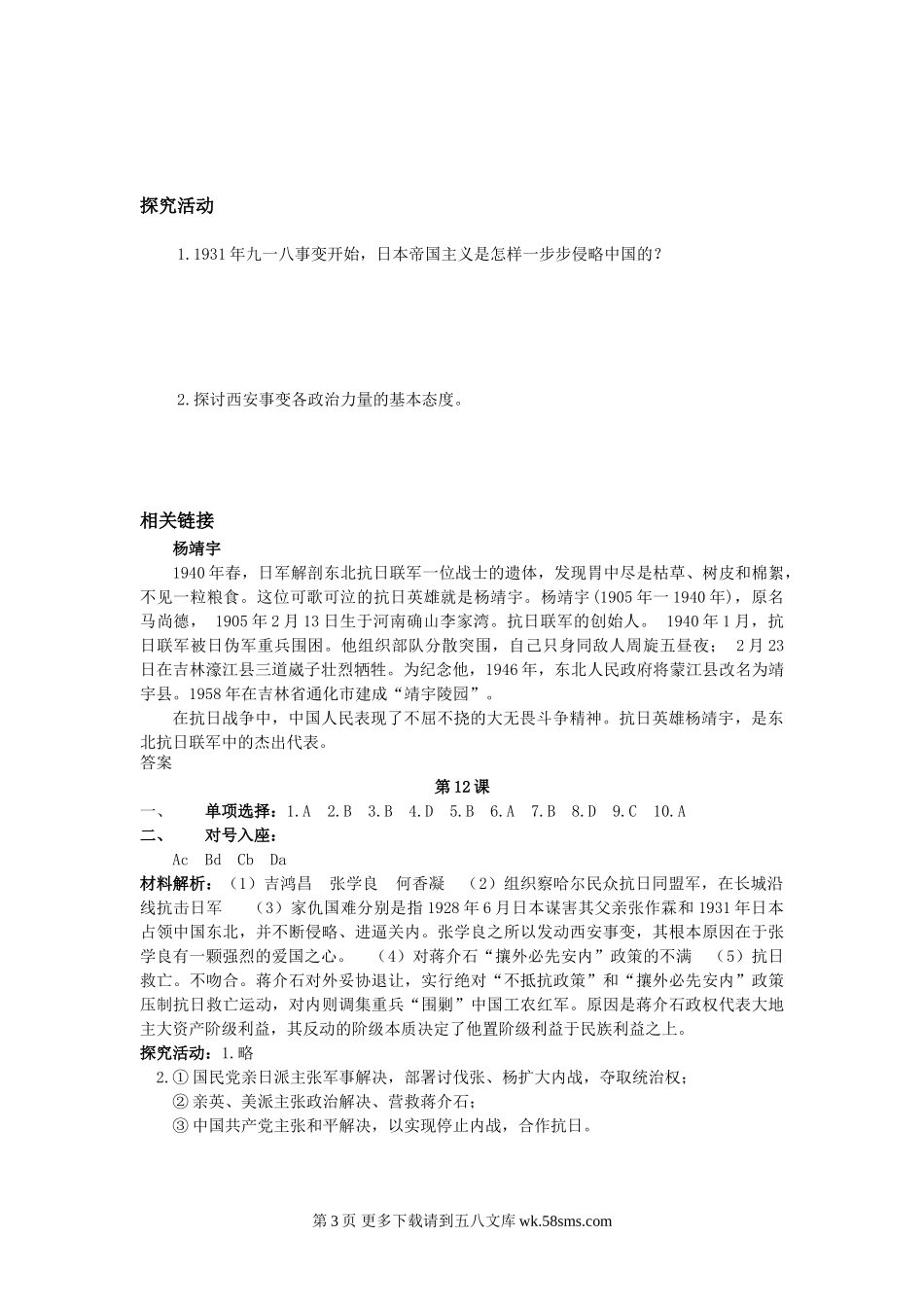 华师大版八年级历史上册同步训练第12课民族危机空前严重参谋意见九一八事变是日本妄图变中国为其独占殖民地的开始,从此,日本帝国主义成为中华民族最危险和最凶恶的敌人,中国人民同日本侵略者之间的民族矛盾上...