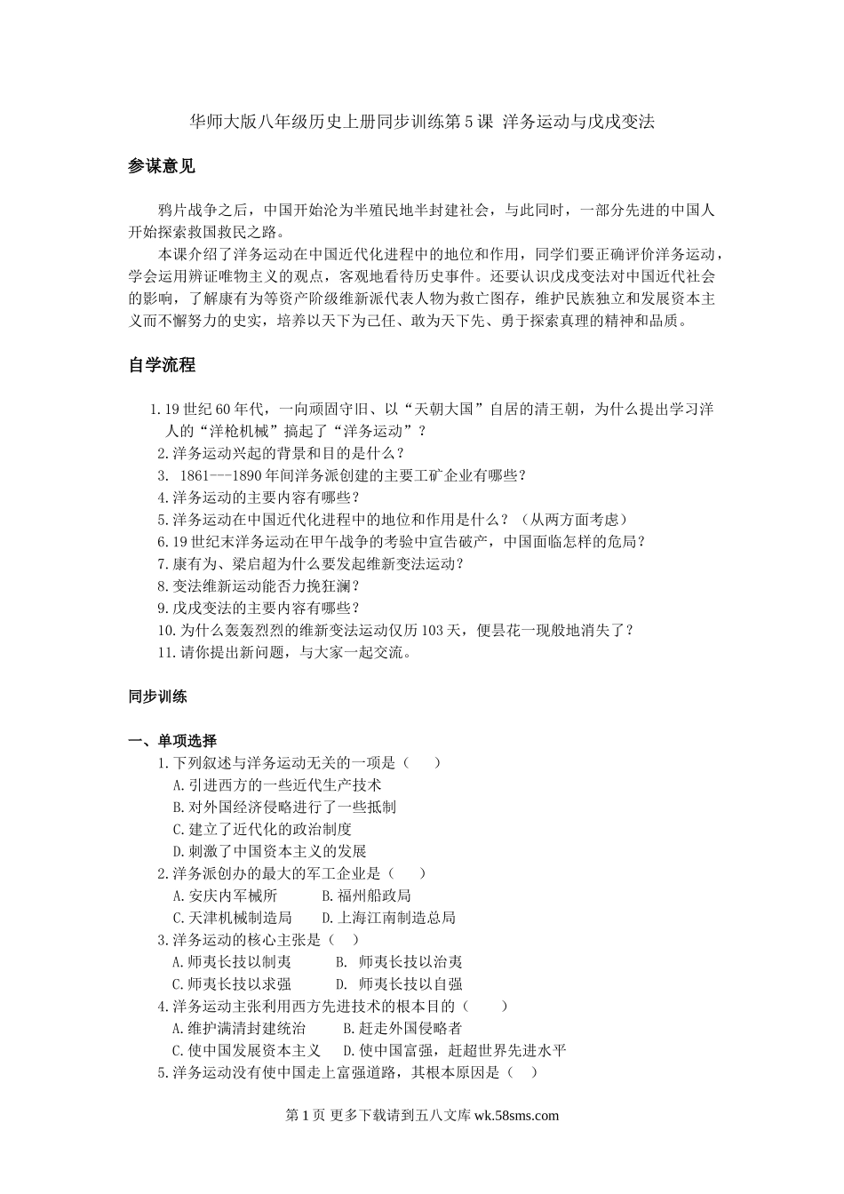 华师大版八年级历史上册同步训练第5课洋务运动与戊戌变法参谋意见鸦片战争之后,中国开始沦为半殖民地半封建社会,与此同时,一部分先进的中国人开始探索救国救民之路。本课介绍了洋务运动在中国近代化进程中的地...