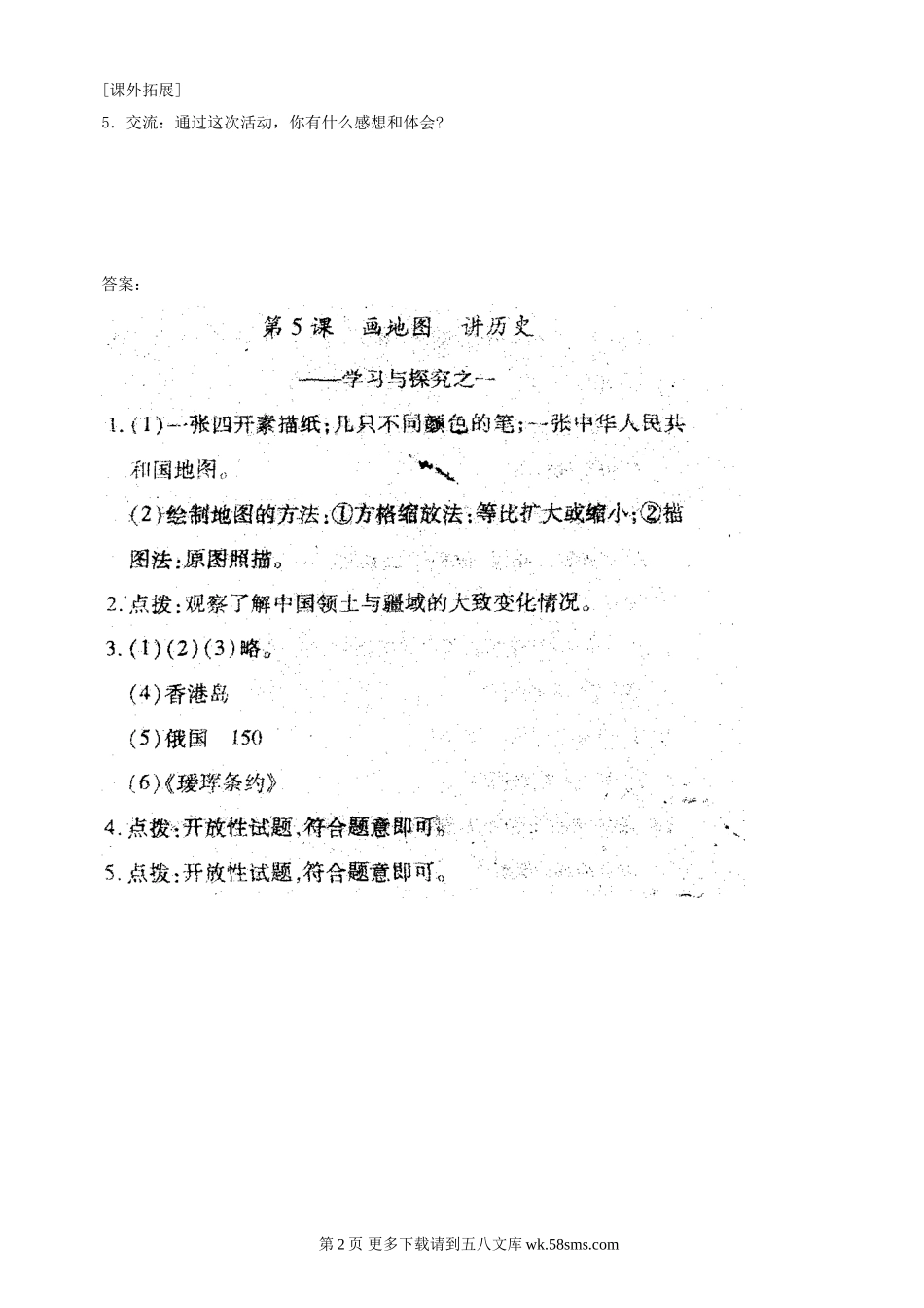 第5课画地图讲历史——学习与探究之一当你看到一幅绘制精确的地图时,一定会感谢那些为我们提供珍贵地理资料的地理专家。你知道吗?我国是世界上最早绘制地图的国家之一。你想尝试一下制图的辛苦与快乐吗?今天就让...